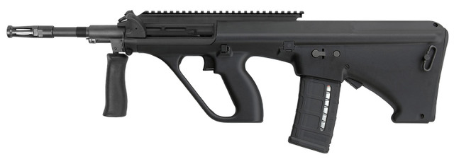 The iconic bullpup-style Steyr AUG has been one of the most recognizable rifles in the world since its adoption by the Austrian army in 1977 and is now available for civilian use as the Steyr AUG A3 M1. The short-stroke gas-piston operation of the AUG runs exceptionally cleaner by nature because all of the operational exhaust gas vents out of the front of the rifle. It also features a quick-change barrel with a collapsible forward grip as well as a two-position cross-bolt safety that locks the trigger. This NATO version rifle accepts genuine Steyr AUG magazines as well as standard STANAG (AR) magazines.